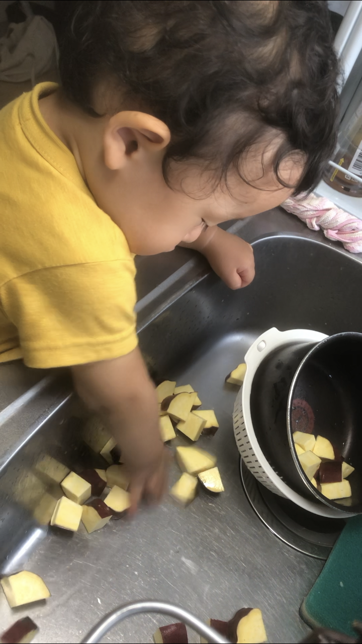 水にさらしていたさつまいもをザルにあける。お手伝い(のような遊び)