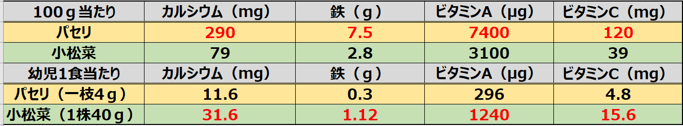 100gあたりでは、どの栄養素も断トツでパセリが多いけれど、
