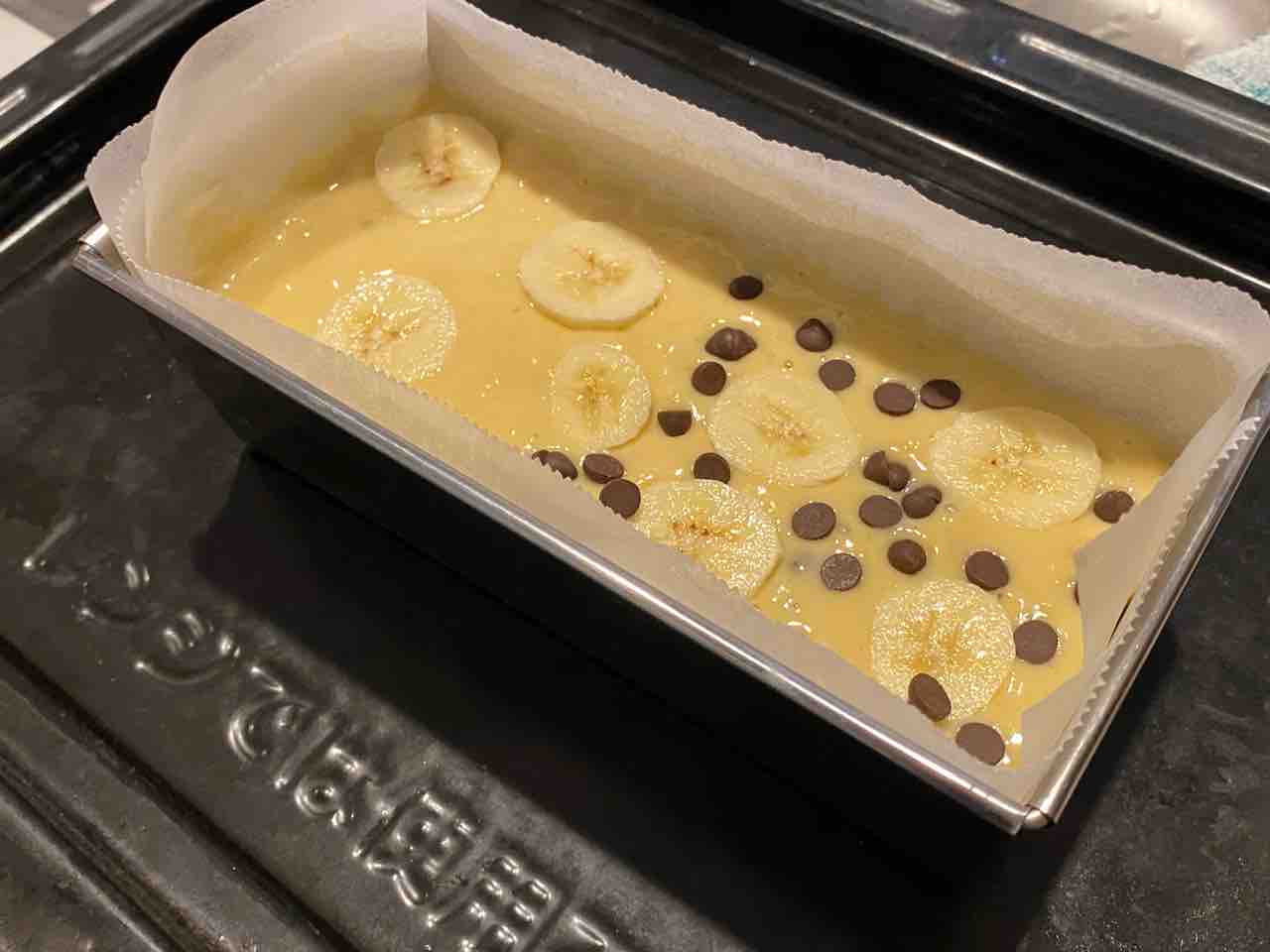 【4】パウンド型にオーブンシートを敷いて生地を流し入れ、半分にチョコを入れて軽く混ぜトッピング用のバナナをのせる。