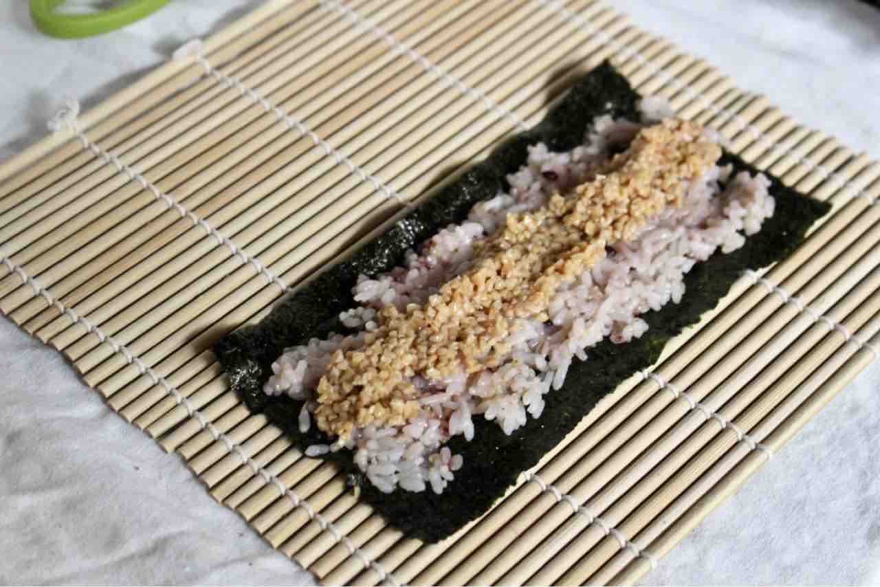 に手巻き海苔をおいて、ごはん(50g程度)をのせます。