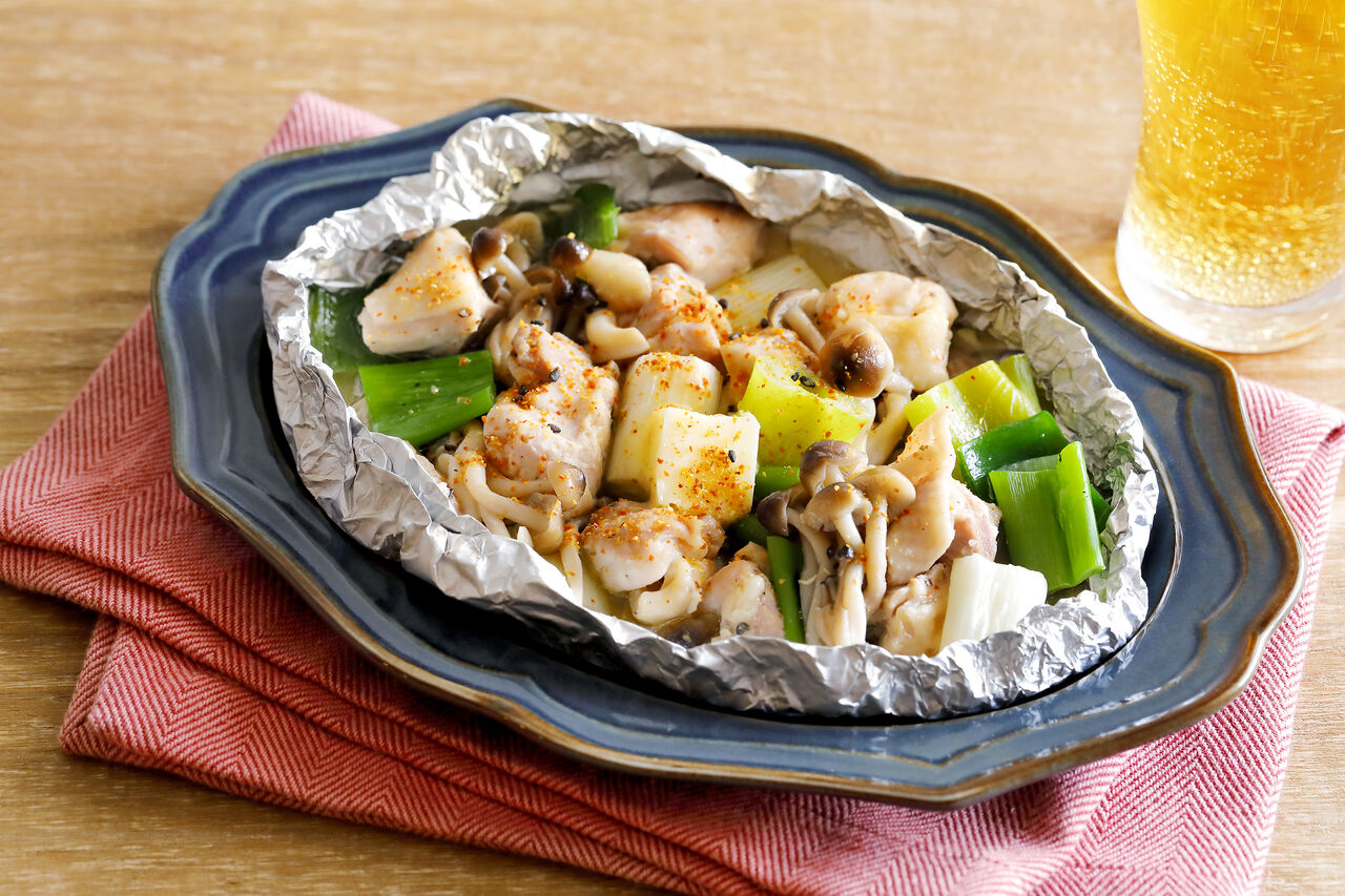 鶏ネギきのこの七味バターホイル焼き