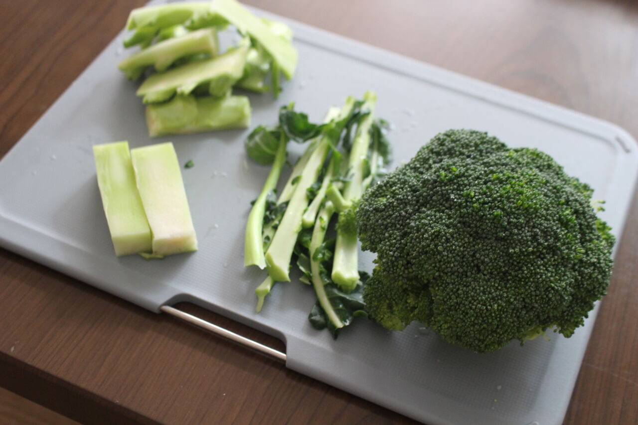 【2】ブロッコリーの太い茎は固い部分を厚めに削ぎ落し、2cm四方の薄切りにする。