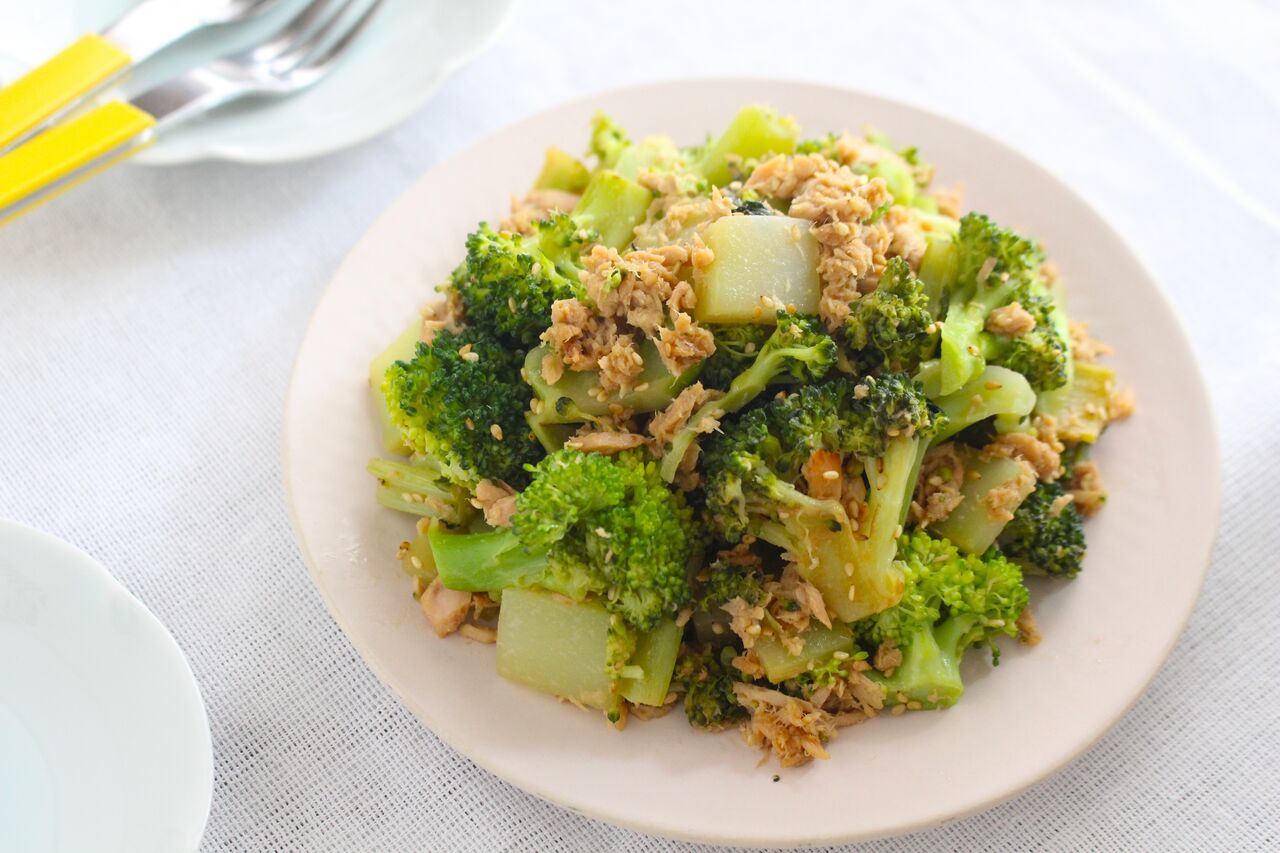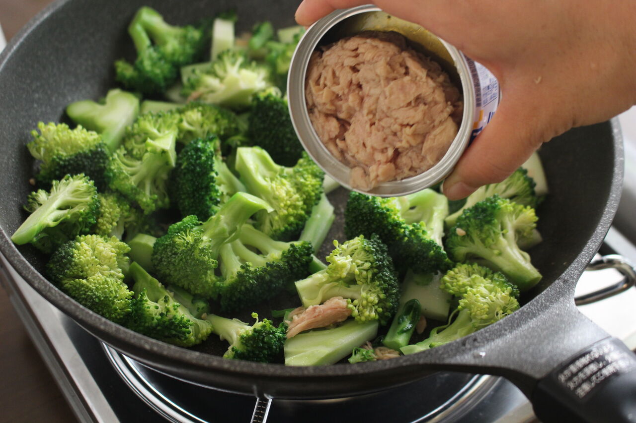 じっくりと蒸し焼きにしたブロッコリーはツナや煮汁の旨味をたっぷりと吸い込みます。