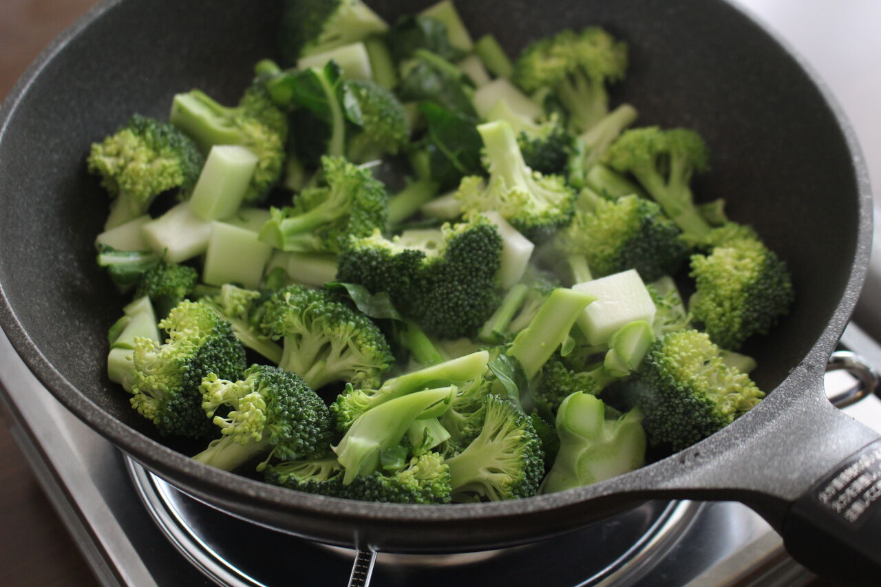 【3】フライパンにごま油をひいて中火にかけ、ブロッコリーを加えて炒める。