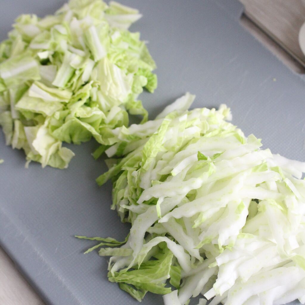1:白菜は芯の部分は5㎜幅の薄切りにし、葉は縦横に包丁を入れて3cm角程度のざく切りにする。