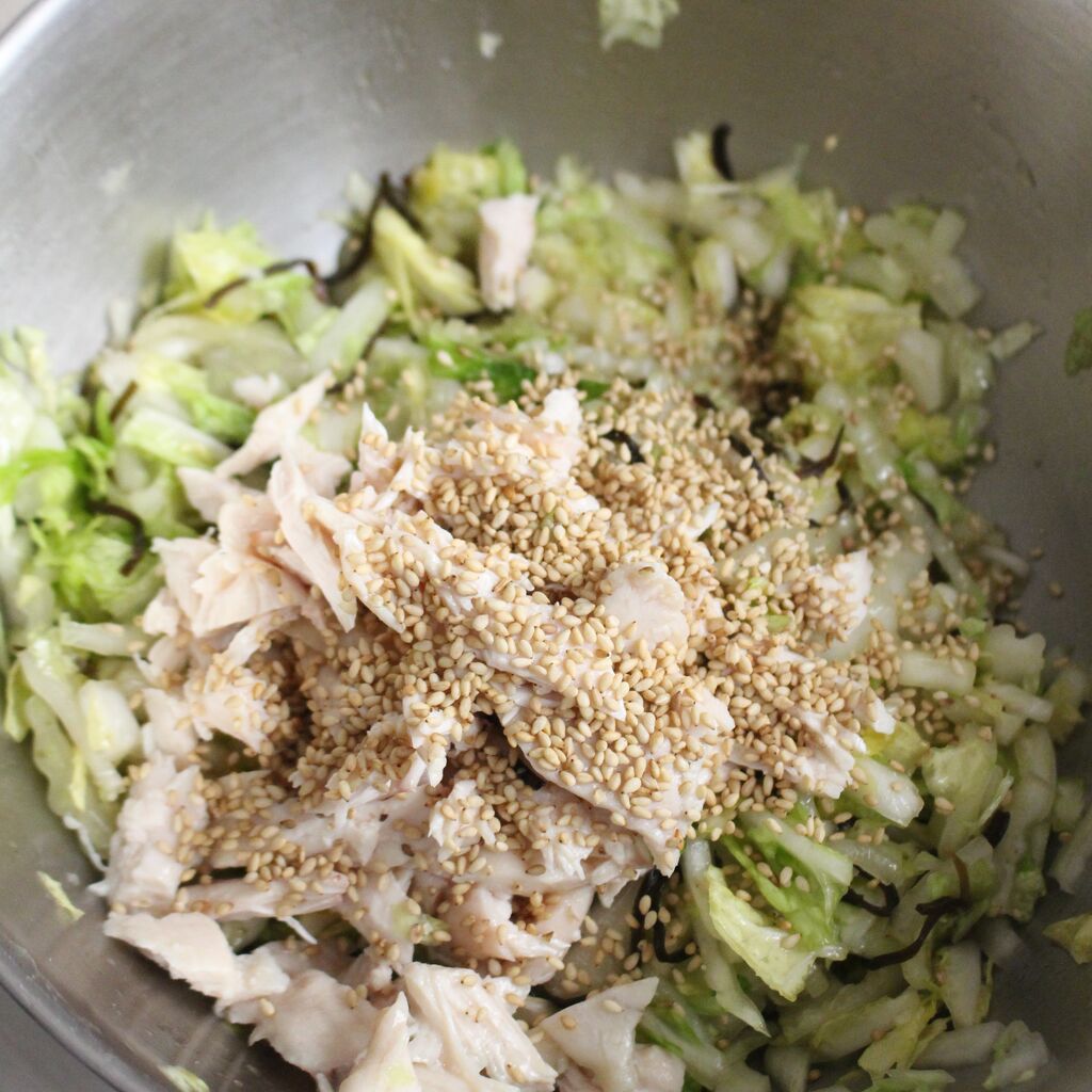 3:食べやすく割いた蒸し鶏(サラダチキンやツナ缶でも)を加え、ごま油、白ごまを加えて和える。