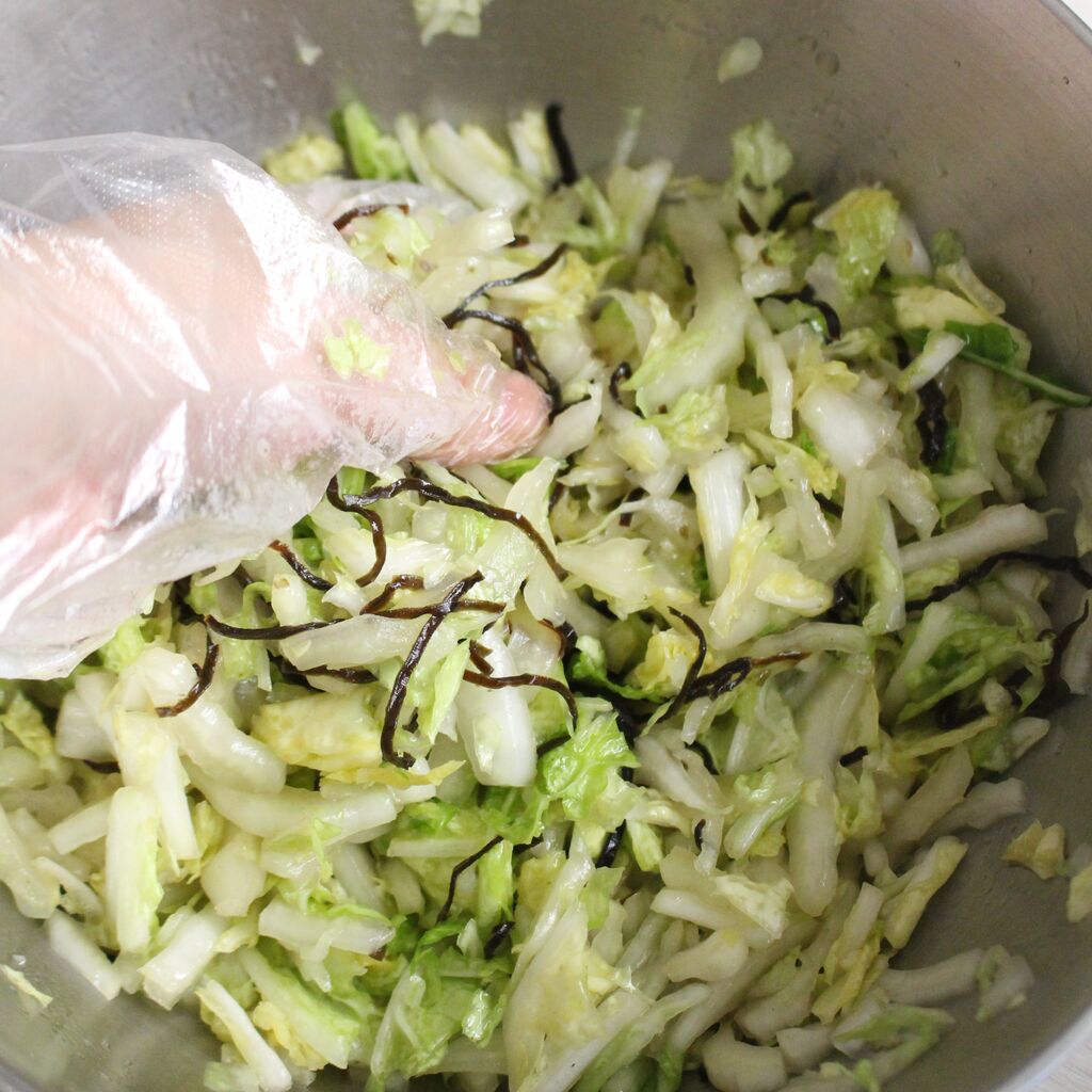 ポリ袋でもよいですが、白菜の量が多いので大きめのボウルの方がやりやすいです。
