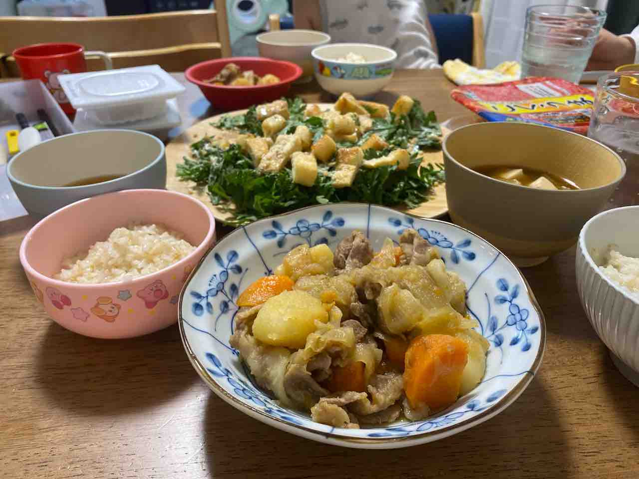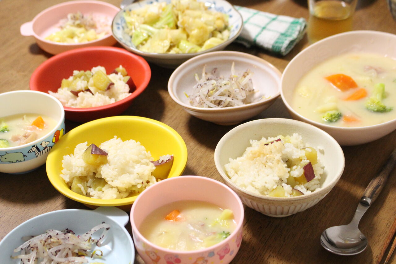 ホワイトシチュー&さつまいもごはん&もやしのゆかり和え