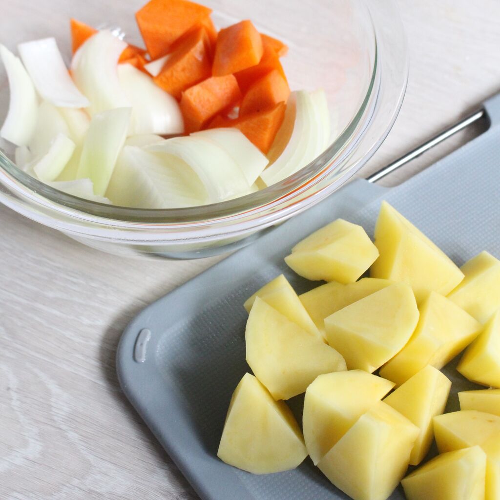 1:豚肉は3cm長さに切る。じゃがいもは3~4cm、にんじんは2~3cmの乱切りにする。たまねぎは半分の長さのくし形切りにする。