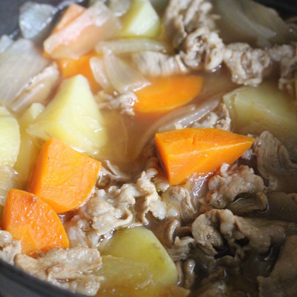 2:鍋に油を入れて中火にかけ、にんじんとたまねぎを加えて5分ほど炒める。たまねぎが透き通ってきたら豚肉を加える。肉に火が通ってきたらじゃがいもを加えてさっと炒めて全体に油を馴染ませる。