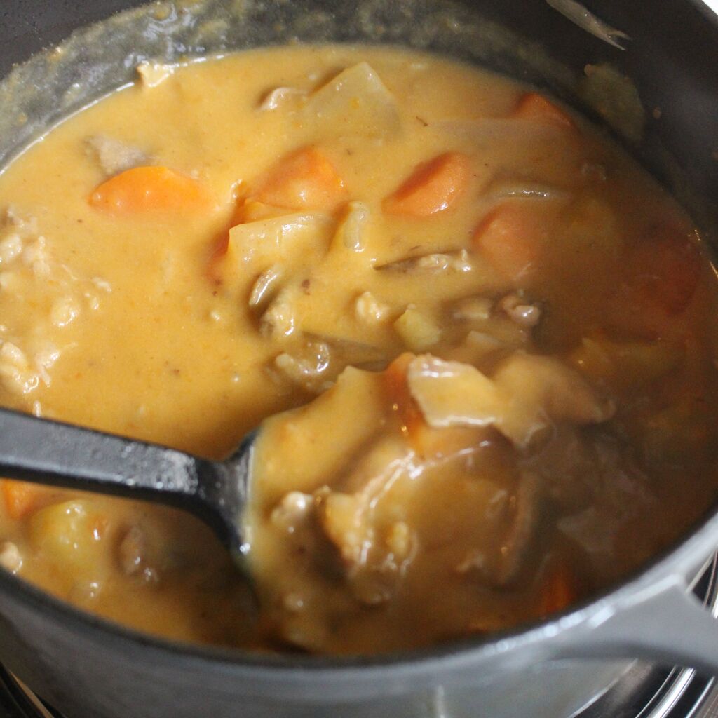 ・ルウはダマにならないようによく混ぜ合わせます。加熱をしていないので、とろみがついてからも弱火で10分ほど煮込んでください。