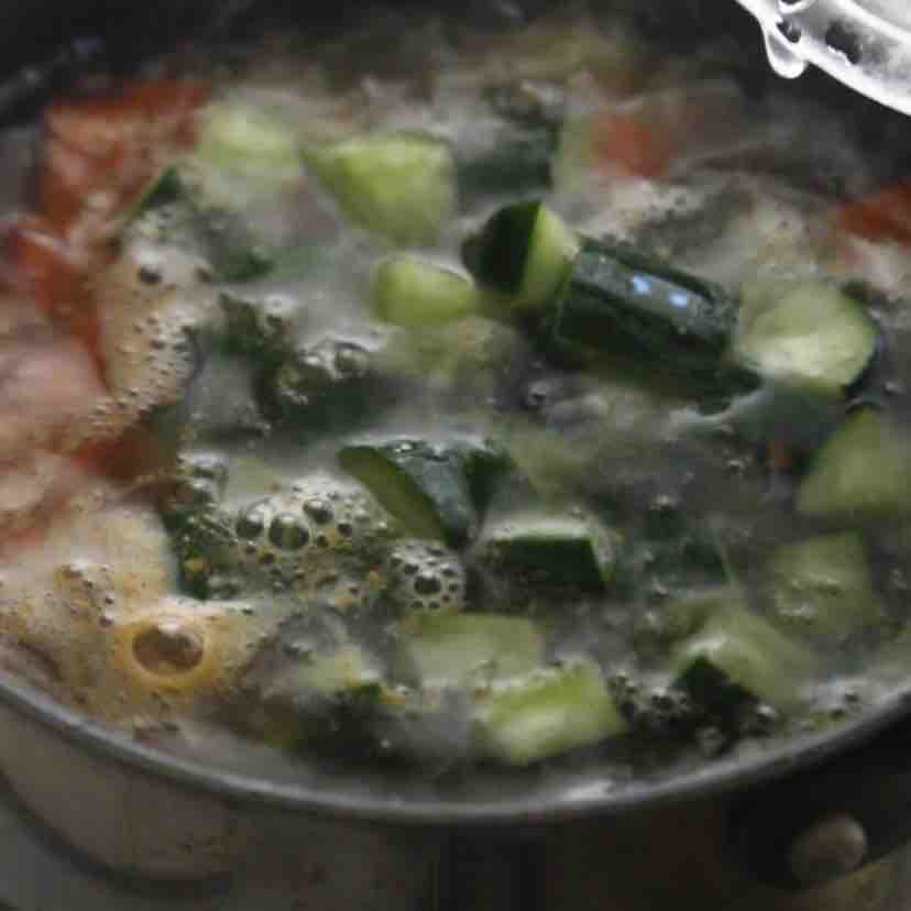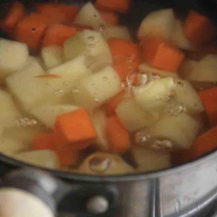 【2】鍋に水(約600ml)と塩(小さじ1)を入れ、じゃがいもとにんじんを加えて強火にかける。