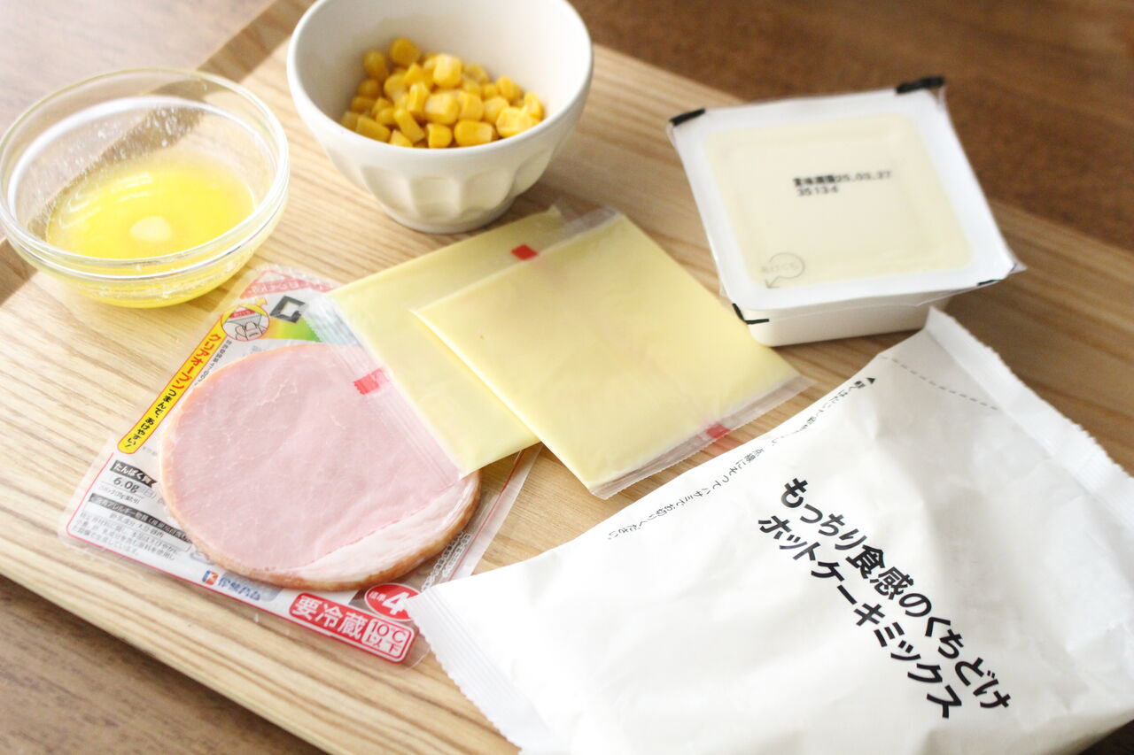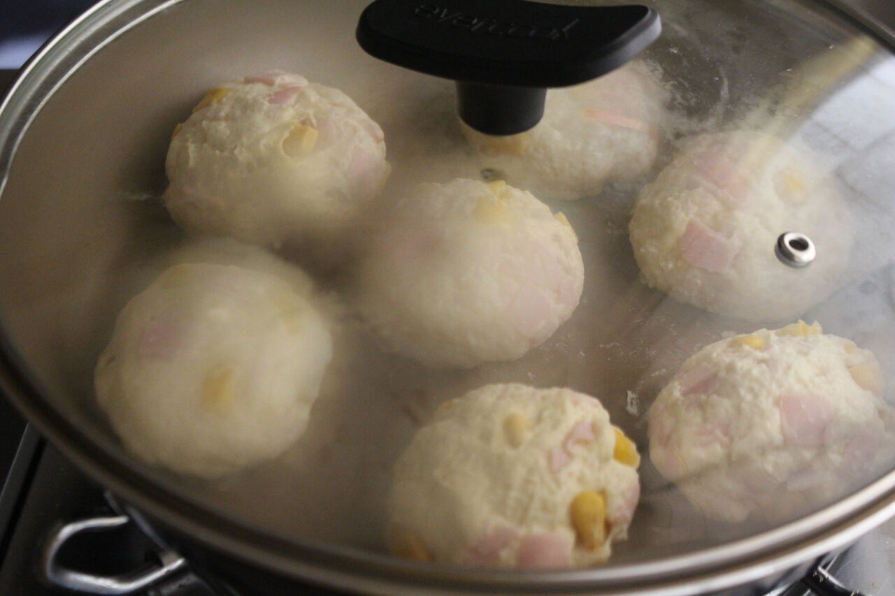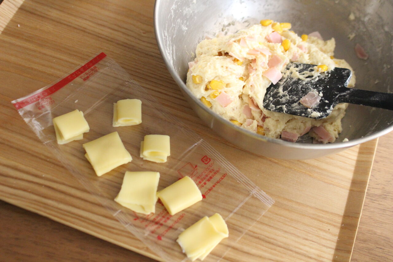 【2】刻んだハムとコーンを加えて混ぜ、7等分にする。