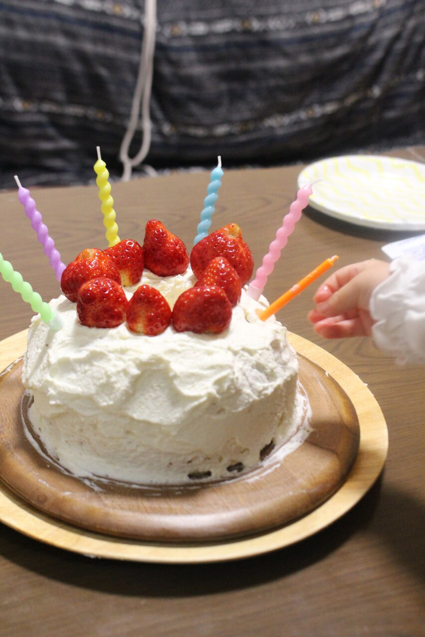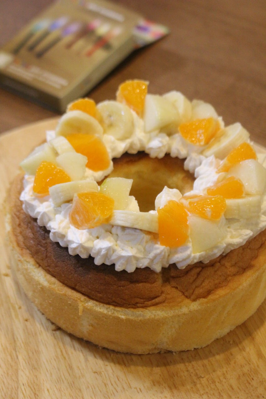 お誕生日ケーキは2回ともmisaさんのレシピ本より米粉のシフォンケーキです。