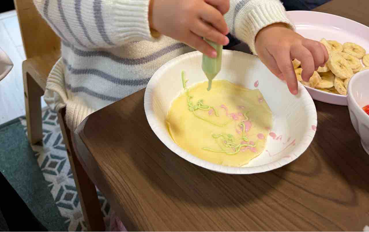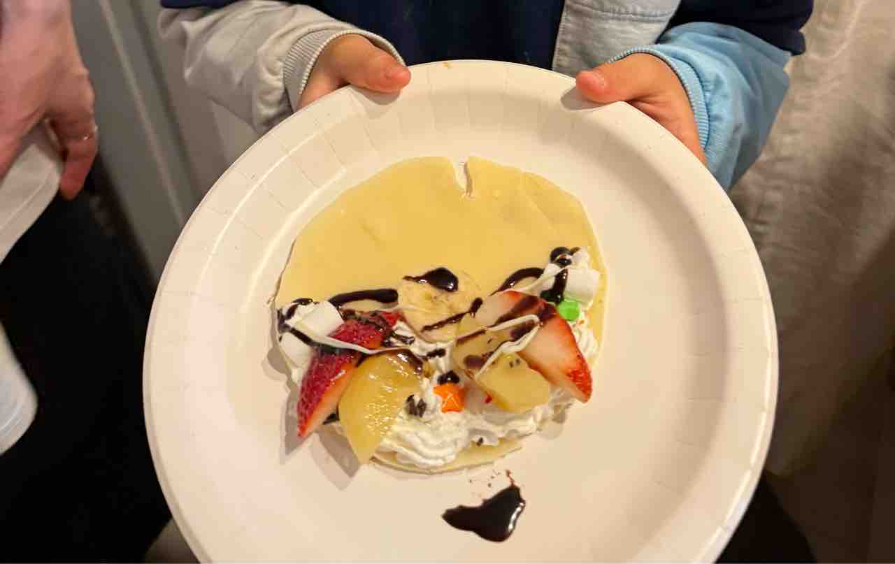 いちごやキウイなどのフルーツやホイップ、チョコペン