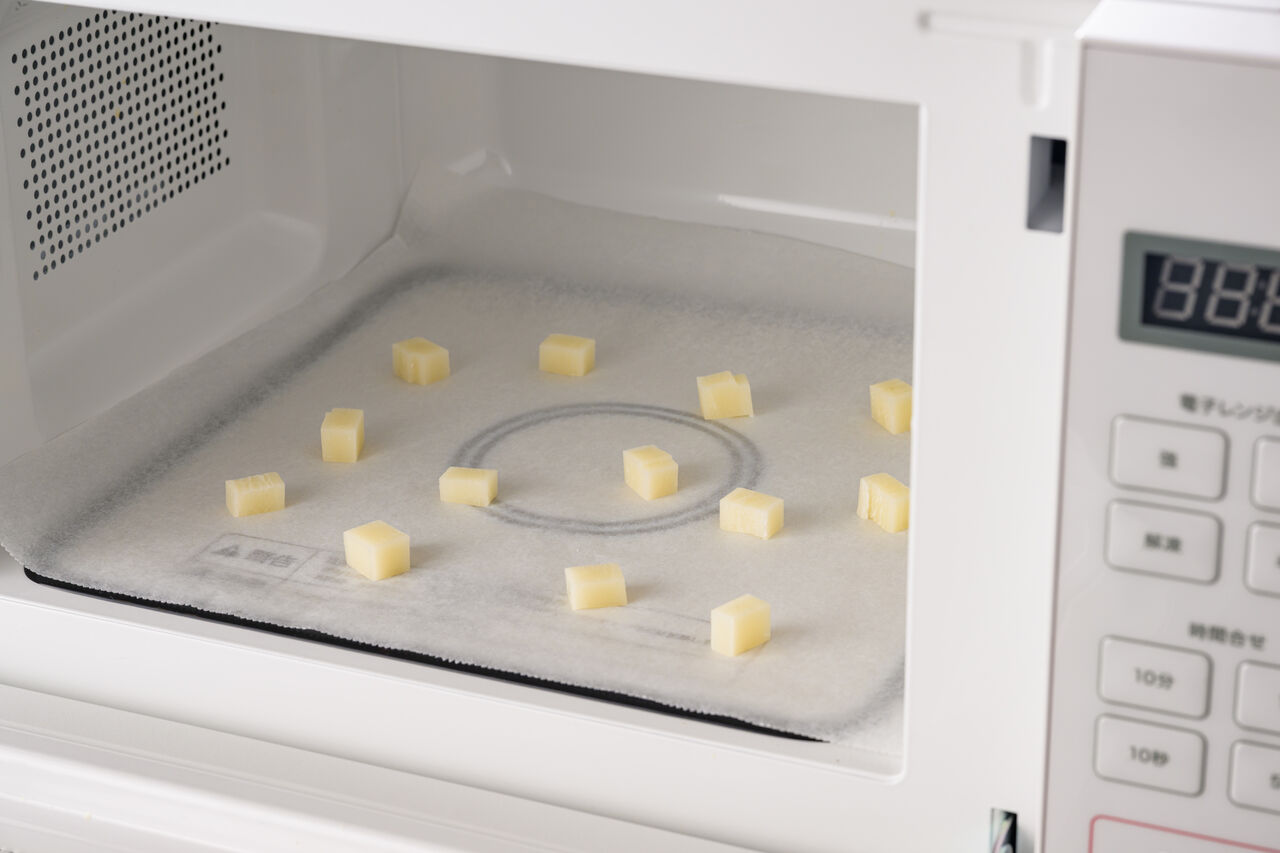 餅同士がくっつかないようにレンジプレートにクッキングシートを敷いて